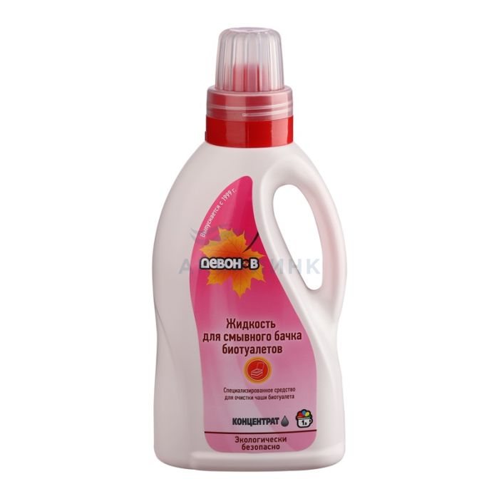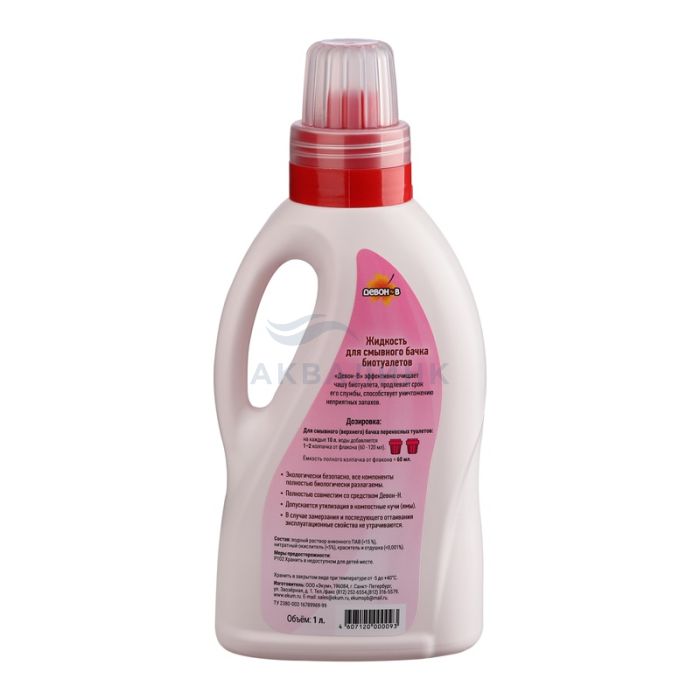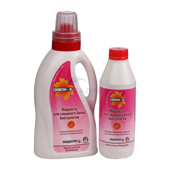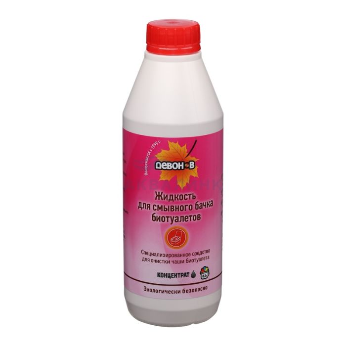 «Девон-В» - специальный ароматизирующий шампунь для верхнего (смывного) бачка биотуалета. Обеспечивает высокоэффективные моющие свойства при омывании приёмной чаши биотуалета, продлевает срок его службы. Полностью совместим со средством Девон-Н (не препятствует уничтожению запахов в приёмной ёмкости биотуалета). Допускается утилизация в компостные ямы (кучи). Экологически безопасно, все компоненты полностью биологически разлагаемы. Жидкость "Девон-В" - эффективный шампунь для Вашего биотуалета.