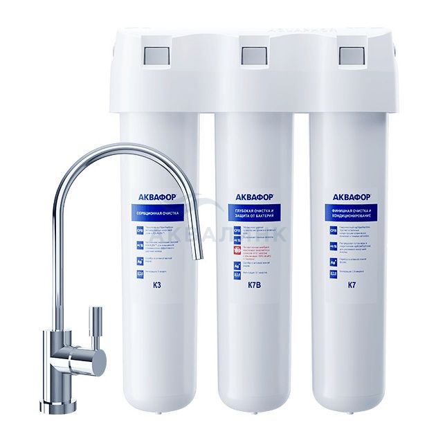 Модуль К3 - предварительная очистка воды, модуль К7B - глубокая очистка и обеззараживание воды, модуль К7 - финишная сорбционная очистка воды, блок коллекторов, соединительная трубка, соединительная трубка со вставленной конической втулкой, узел подключения, кран для чистой воды, заглушка, ключ-вилка, руководство по эксплуатации, комплект упаковки