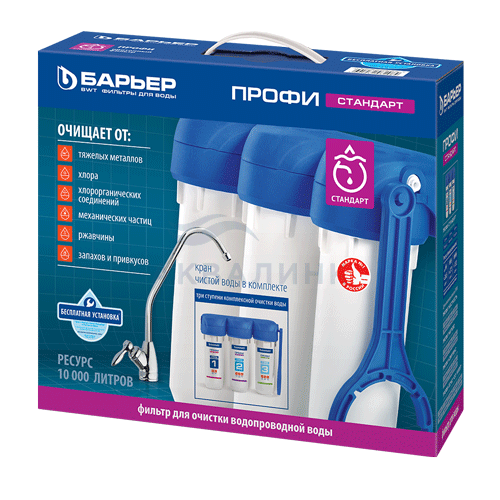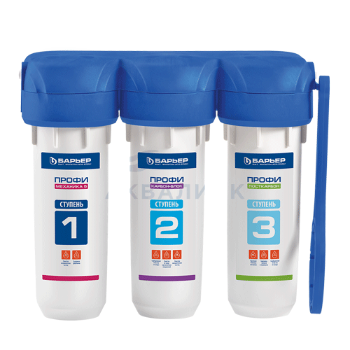 "Комплексная очистка водопроводной воды от всех основных содержащихся в ней вредных примесей. Быстрое подключение к водопроводу Quick Fitting. 3 ступени очистки Кран в комплекте. Благодаря удобному подвесному кронштейну фильтр легко устанавливать и снимать для замены картриджей. Передовые технологии очистки водопроводной воды"