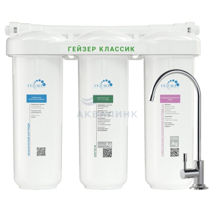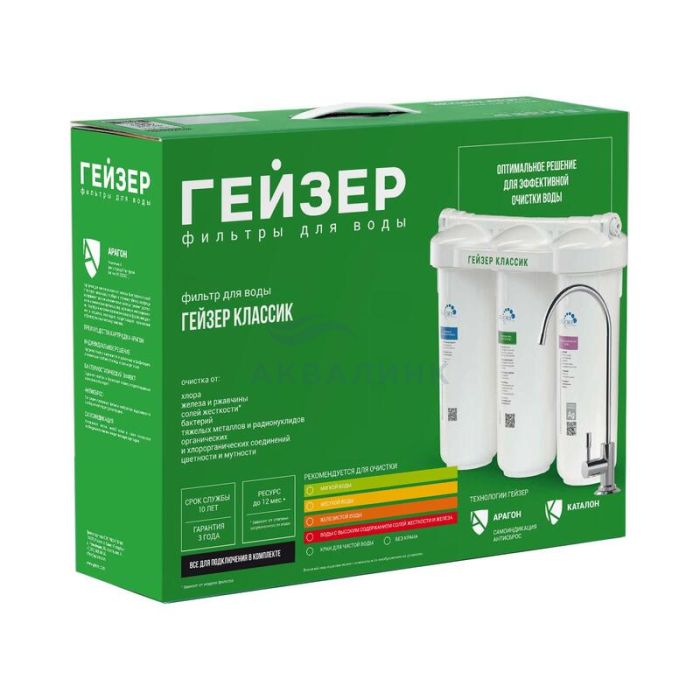 Фильтр Гейзер Классик для мягкой воды специально разработан для регионов с мягкой водой (низкий уровень минерализации). Важным свойством фильтра является самоиндикация — уменьшение напора в кране для чистой воды, фильтр сам подскажет, когда пришло время менять картриджи. Картридж Арагон-М можно многократно регенерировать (восстанавливать его свойства в домашних условиях), что позволит Вам сэкономить на покупке сменных картриджей. В фильтре Гейзер Классик для мягкой воды используется новая разработка компании Гейзер — картридж БАФ, содержащий мультикомпонентную загрузку на основе сорбентов и ионообменных материалов. Это позволяет удалять не только хлор и органические примеси, но и снижать содержание железа и тяжелых металлов. Картридж БАФ является прекрасной альтернативой используемых в других моделях фильтров картриджей СВС и ММВ.