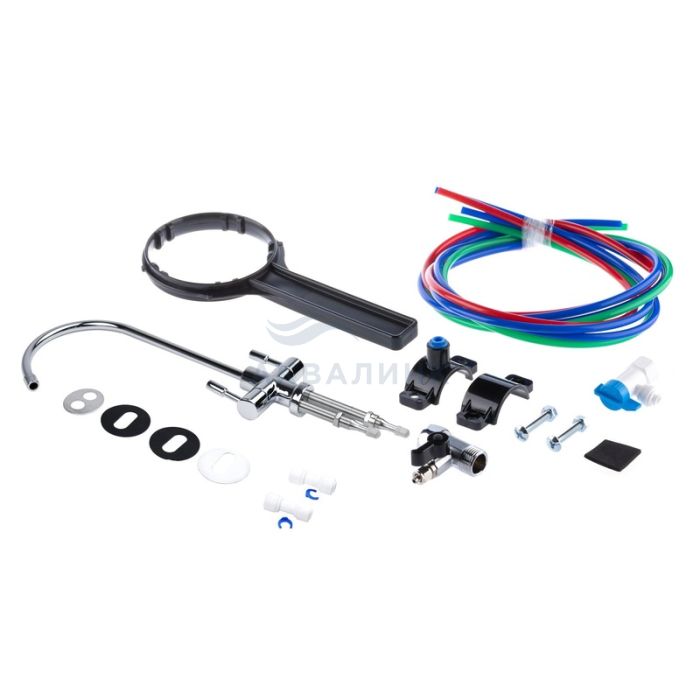 Корпуса с фильтрующими элементами в сборе на каркасе Вентиль накопительного бака Металлический накопительный бак 12 литров Кран для чистой воды FlowMaster Duo Ограничитель дренажного потока Обратный клапан Реле высокого давления Дренажный хомут Тройник (адаптер) с краном подачи воды Трубка 1/4'' Реле низкого давления Соленоидный клапан Насос (помпа) Инструкция