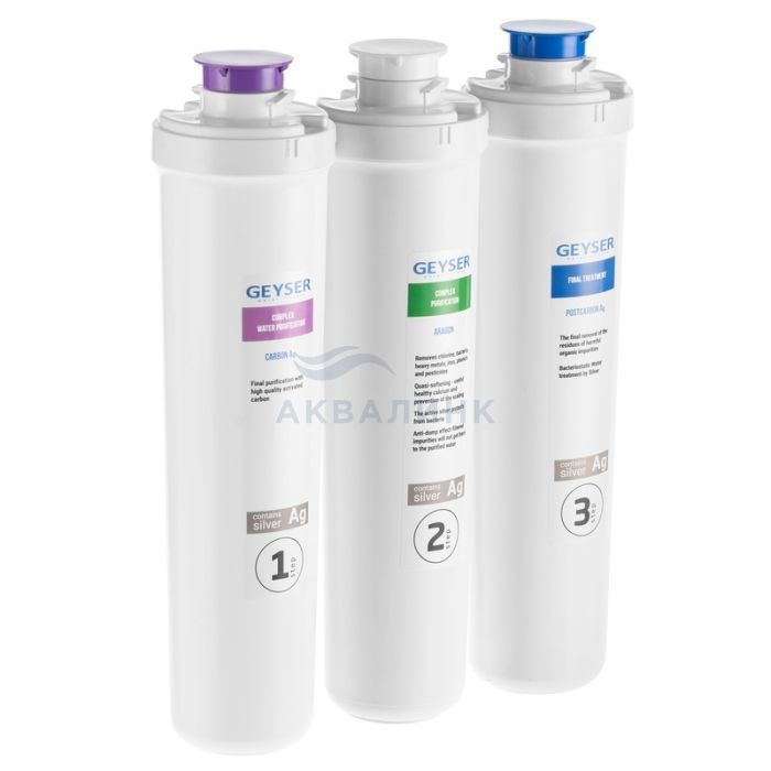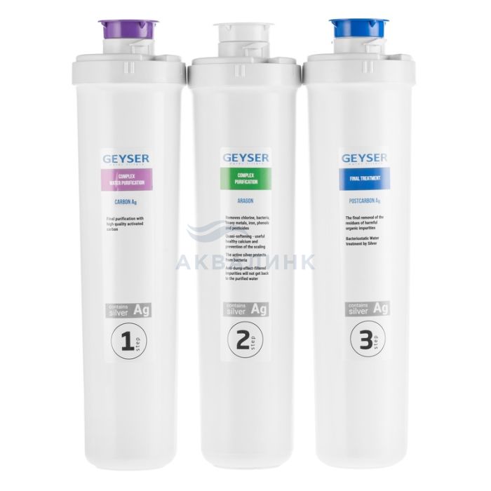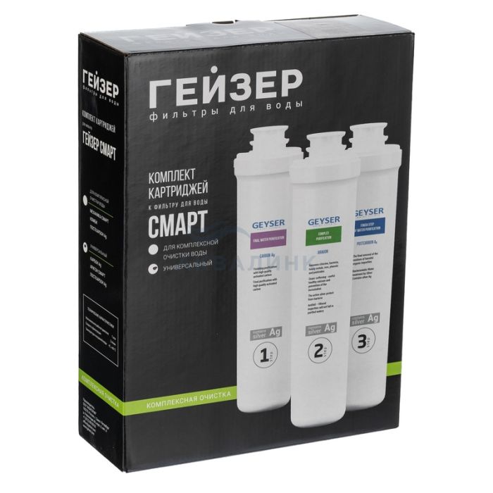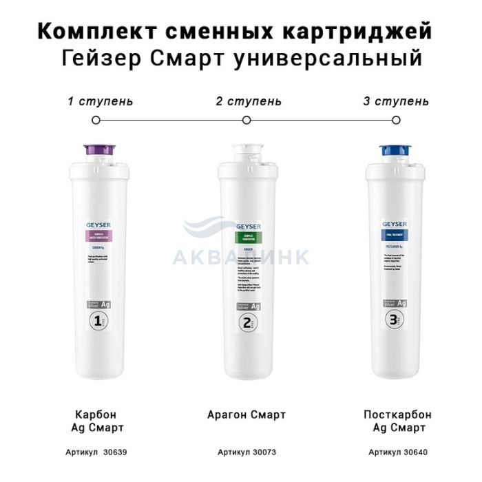 Для мягкой воды. Комплект сменных быстросъемных картриджей для фильтра Гейзер Смарт универсальный. Карбон Ag — мультикомпонентная загрузка. Удаляет растворенное и коллоидное железо, тяжелые металлы, органические примеси. Содержит серебро. Арагон Смарт — удаляет механические примеси, растворенное железо, тяжелые металлы, радионуклиды и бактерии. Посткарбон Ag — высококачественный кокосовый уголь. Удаляет хлор, органические и хлорорганические соединения. Улучшает вкус, цвет, прозрачность воды и устраняет посторонние запахи. Содержит серебро.