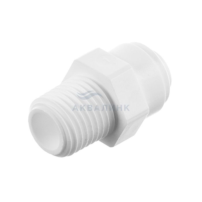 Прямой переходник с наружной резьбы 1/4" на цанговый разъем 1/4". Материал – пищевой пластик. Используется в системах водоподготовки и бытовых фильтрах для воды.
