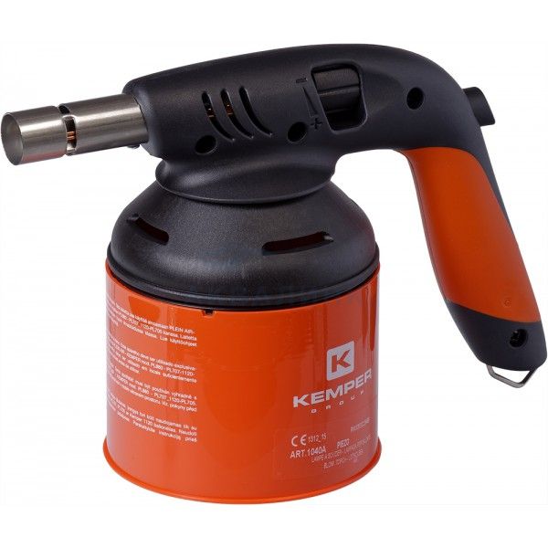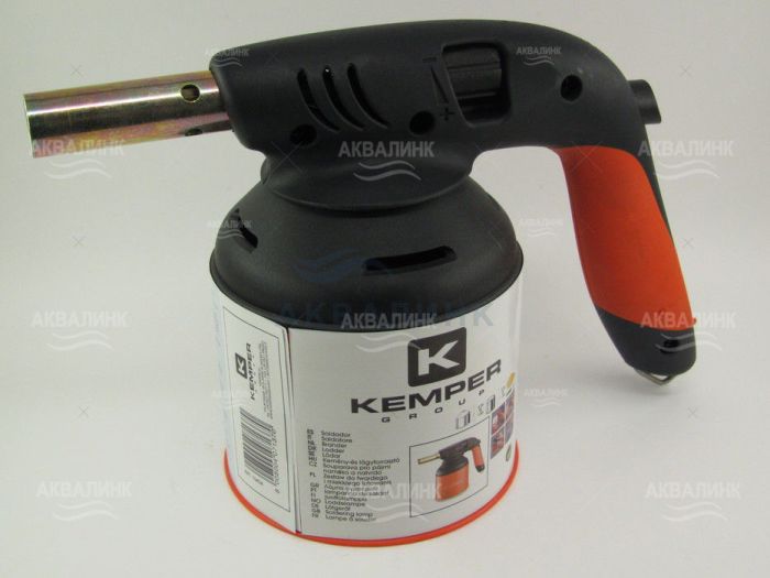 "Универсальная газовая паяльная лампа для прокалываемых и резьбовых баллонов. Оснащена системой пьезоподжига, дополнительного нагрева газа, регулировкой пламени и подачи воздуха. Имеет удобную прорезиненную ручку и крючок для подвеса лампы. Рассчитана на температуру до 2000 °С. Максимальный расход газа: 140 гр./час. Для работы с баллонами Kemper: 1120, PL707, 1121F. Поставляется без баллона."