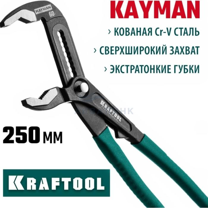 Переставные клещи KRAFTOOL Kayman 250 мм 22353-25 применяются при ремонтных и демонтажных работах. Рабочая часть изготовлена из хромованадиевой стали и имеет фосфатированное покрытие, что увеличивает срок службы инструмента и защищает от коррозии. Губки оснащены переставным механизмом, позволяющим регулировать клещи под размер детали. Максимальный захват составляет 60 мм. - Экстратонкие губки для труднодоступных мест - Высокая надежность конструкции обеспечивается шарнирным соединением с двумя направляющими - Специальная форма зева обеспечивает самоблокирующийся захват деталей - Изготовлены из высококачественной хромованадиевой стали методом ковки - Рабочие поверхности закалены - Быстрая регулировка - Рукоятки с противоскользящим покрытием обеспечивают надежный и комфортный захват