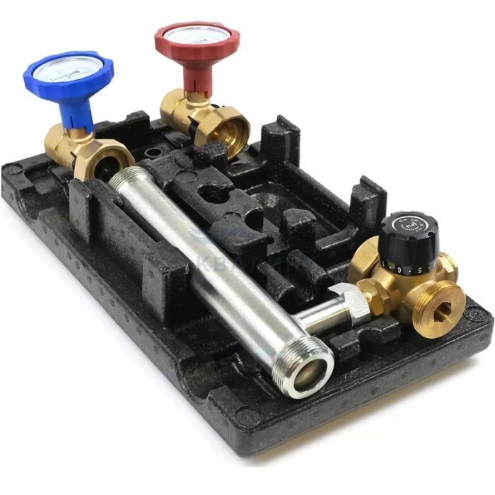 Насосная группа TIM с термостатическим смесительным клапаном без насоса применяется в контурах отопления, где необходимо регулировать температуру теплоносителя, например, теплый пол. Комплект поставки: Термостатический смесительный клапан; Запорная арматура; Термометры в запорных узлах подающей и обратной линий; Без циркуляционного насоса; Блочная термоизоляция. Общий номинальный диаметр, DN — 25; Верхнее подсоединение — 1" ВР; Нижнее подсоединение — 1½" НР; Резьба для подсоединения насоса — 1½" НГ; Присоединительная насосное расстояние — 180 мм; Давление рабочее, max — 6 бар; Пропускная способность (max Kvs при падении напора в 1 бар) — 9,8 м³/час; Макс. тепловая мощность Qmax, при падении t° = 10°C и Vтеплоноситель = 1 м/с — 24 кВт; Пределы рабочей темп-ры — от –15°С до +110°С; Макс. темп-ра окруж. среды — 40°С; Шкалы термометров — от 0°С до Особенности: с термостатическим клапаном