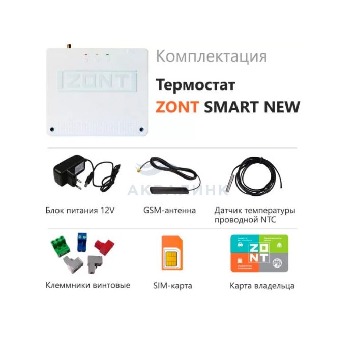 ZONT SMART NEW – обновленная версия популярного термостата ZONT SMART. В приборе теперь 2 вида связи – Wi-Fi и GSM. Для подключения оригинальных устройств ZONT к термостату на удаленном расстоянии добавлен профессиональный интерфейс RS-485. В специальные входы возможно подключить помехозащищенные температурные датчики типа NTC (1 шт. входит в комплект). Класс защиты: IP20 Питание: 10-28 В Температура транспортировки и хранения: до -40 °С Wi-Fi: 2,4 ГГц GSM: 850, 900, 1800, 1900 МГц Тип термостата: отопительный термостат, обновленная версия H-1V с 2 видами связи – Wi-Fi и GSM Коммутируемое напряжение: 240 В Коммутируемый ток: 3 А Допустимая относительная влажность: 85% Потребляемая мощность: 6 Вт