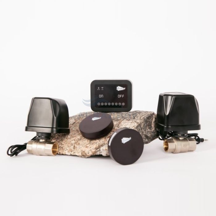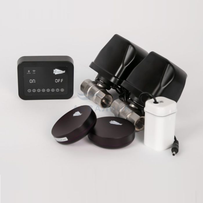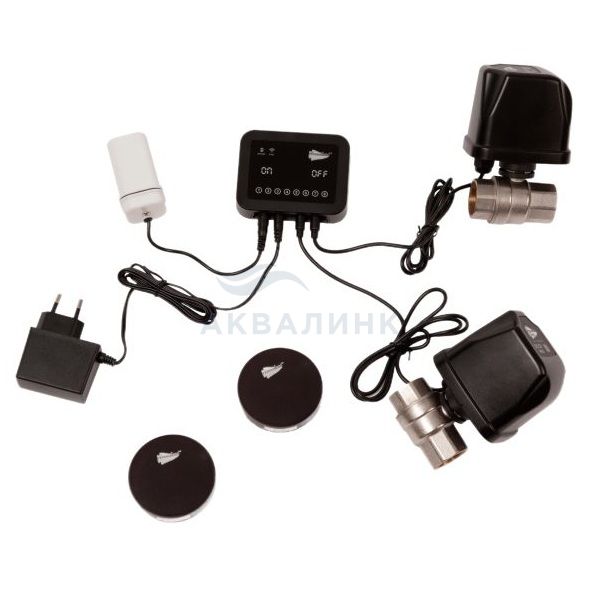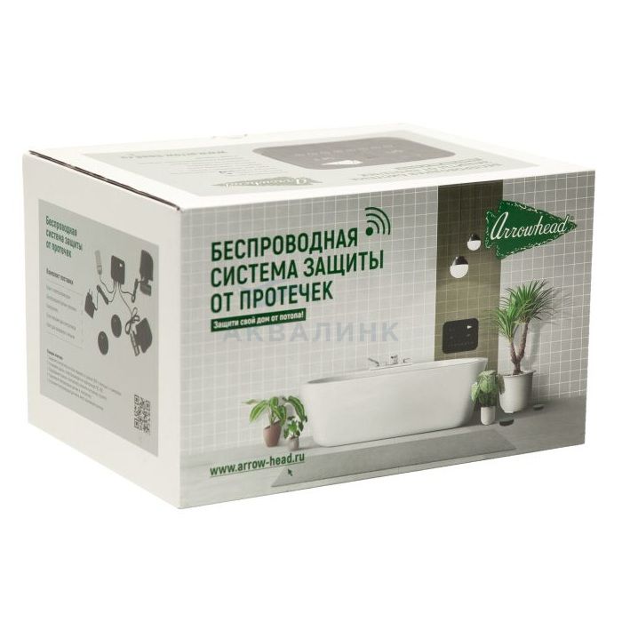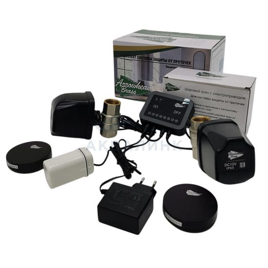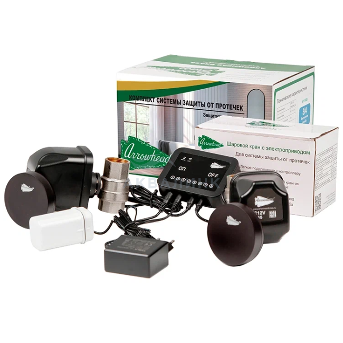 "Комплект системы защиты от протечек ARROWHEAD с беспроводными датчиками, 3/4"" : ( Комплектность : Контроллер управления до 8-ми датчиков - 1 шт. Шаровой кран (PN 40, DN 3/4"") с быстросъемным электроприводом - 2 шт. Беспроводной датчик протечки - 2 шт. Адаптер питания 220В/12В - 1 шт. Кейс для батареек резервного питания - 1 шт. )"
