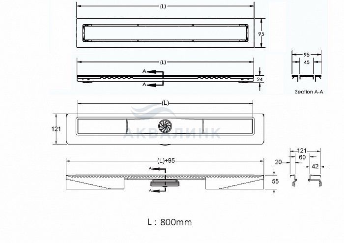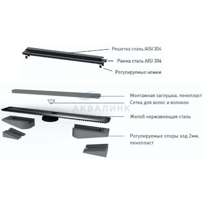 Решетка и рамка толщина 3мм, нержавеющая сталь AISI 304 Комплект регулировки высоты от 12 до 27 мм Сетка для волос, пластик Комплект рулонной гидроизоляции Желоб водосток, нержавеющая сталь AISI 304 Монтажная заглушка и регулируемые по высоте ножки, пенопласт Самопромывной S-образный сифон PP Горизонтальный выпуск D50 H60, пропускная способность 42л/мин, монтаж 360° Монтажный ключ, пластик