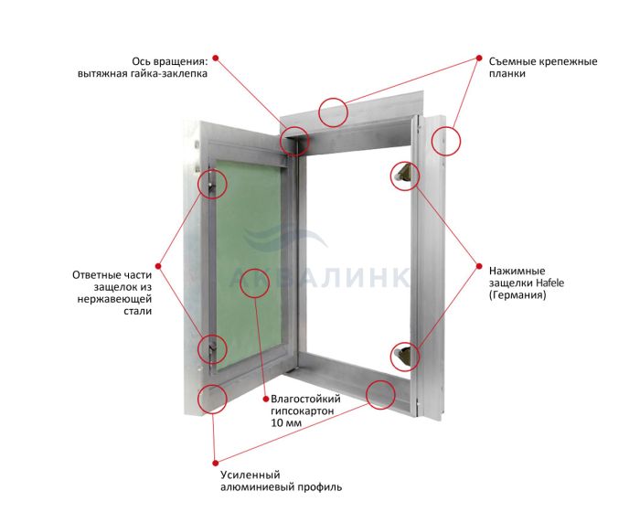 Люк под плитку алюминиевый нажимной Нажимной механизм обеспечивает простое открытие Легкость регулировки по горизонтали и вертикали Усиленная конструкция петли Не требует подрезки и подгонки плитки в зоне люка Может быть вмонтирован в стены из различных материалов Резиновый уплотнитель гарантирует герметичность и непопадание влаги