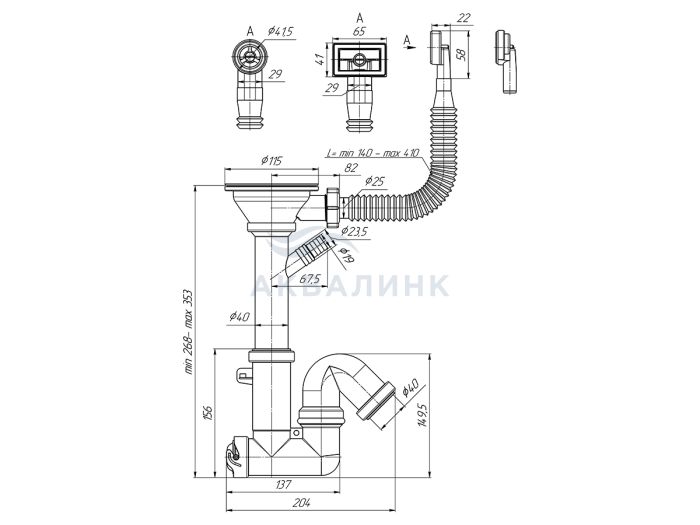 Сифон прямоточный для кухонной мойки с инновационным затвором . Сифоны группы «F»-сифон без гаек. Сифон F1045S с разборным выпуском и нержавеющей решеткой, с отводом для подключения бытовой техники. С гибким круглым и прямоугольным переливом для моек из композитных материалов. Выход для подключения к канализации 40мм. Величина гидрозатвора 60мм. Длина винта 40мм. Комплектация F1045S: Выпуск 3½” (90мм); Гибкий круглый перелив; прямоугольный перелив; Один отвод для подключения бытовой техники