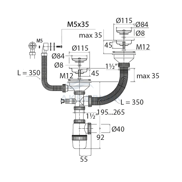 Сифон VIRPlast Элит D112 для двойной мойки, с отводом для стиральной машины, круглый перелив 30986178