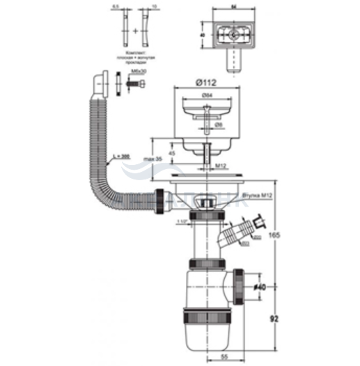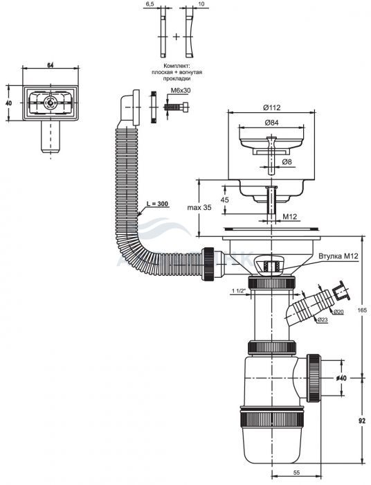 Сифон VIRPlast Элит D112 для мойки, c отводом для стиральной машины, прямоугольный перелив 30986176