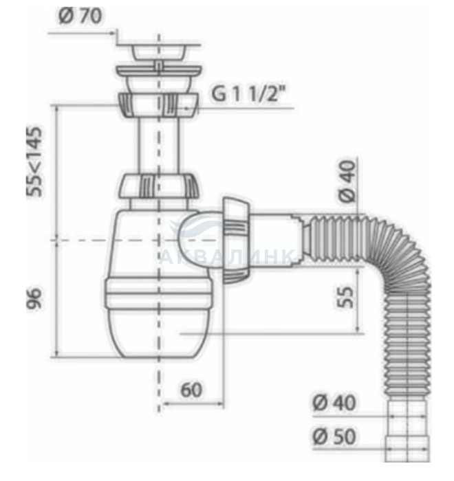 Сифон АНИ Пласт F1045S 3-1/2х40 прямоточный, c отводом для стир. машины, с переливом