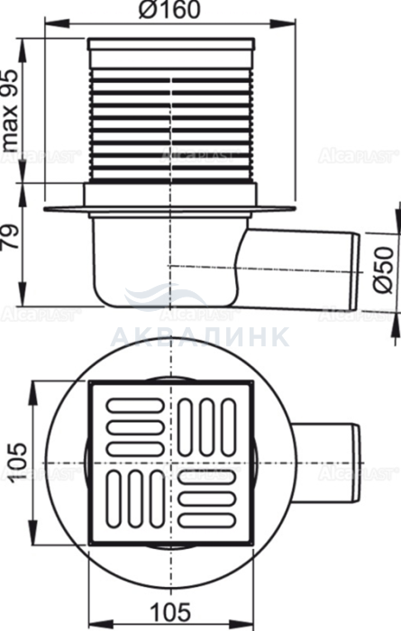Трап AlcaPlast APV1324 105x105/50 мм горизонтальный