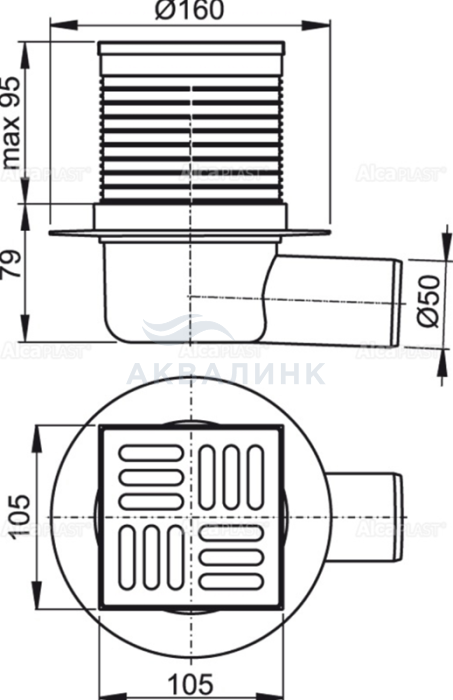 Трап AlcaPlast APV31 SMART 105 х 105/50 горизонтальный с металлической решеткой