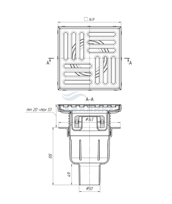 Трап АНИ Пласт 150х150/50мм вертикальный регулируемый TQ5712