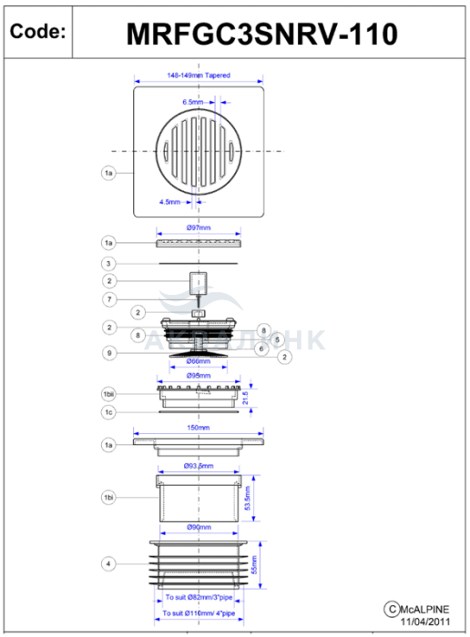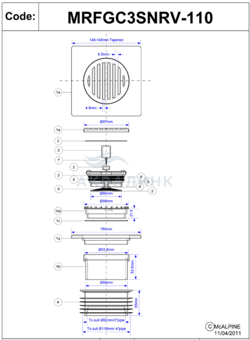 Трап McAlpine MRFGC3SNRV-110 150х150/90/110