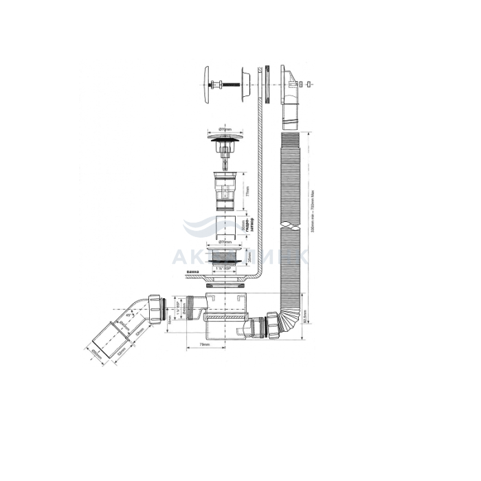 Возможность прочистки гидрозатвора через сливное отверстие, без разборки изделия! Теперь не нужно лезть под ванну! Возможность поворачивать сифон на шарнире после монтажа обвязки! Сифон бутылочный MRB11 (1 1/2"х40мм) для ванн: - с раздвижным переливом (L380- 700ммхD34мм), - металлическими 70мм сливной решеткой и пробкой тип-"кнопка" - пропускная способность (л/мин): 64 - высота гидрозатвора 50мм; - выход Дн=40/50мм; - цвет-хром - материал: пластик. Обвязка автоматическая с пробкой-кнопкой ("Click-Clack") позволяет перекрывать сливное отверстие легким нажатием, а повторное нажатие позволит открыть слив и спустить воду.