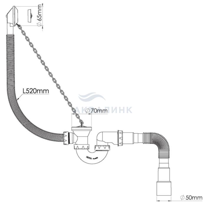 Сифон для ванны U-образный,выпуск 70мм, с пластмассовой цепочкой,выход гибкая труба 1 1/2- Ø40/50