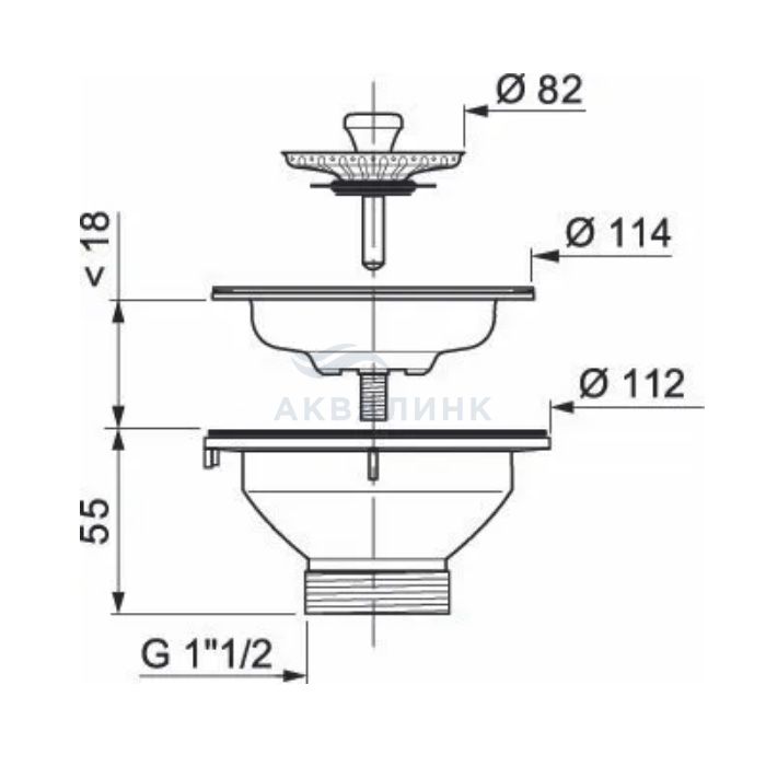 Высота 55 мм Вход 3-1/2" Выход 1-1/2" Решетка из нержавеющей стали Ø114 мм, диаметр чаши Ø112 мм, решётка с затвором Выпуск Ø90 мм Для моек толщиной до 18 мм