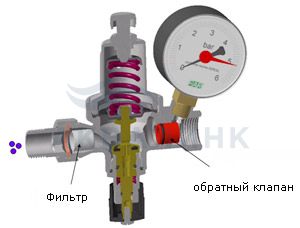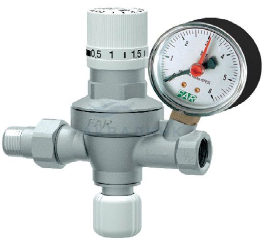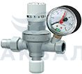 Редуктор подпитки – это устройство, позволяющее автоматически поддерживать требуемое давление в системе отопления. Использование редуктора позволяет автоматически компенсировать падение давления, вызываемое выпуском воздуха из контура через воздухоотводчики. Ручка регулирования давления Для поддержания требуемого давления в системе отопления нужно совместить значение требуемого давления на регулирующей ручке с контрольной риской. Диапазон настраиваемого давления от 0,5 до 4 бар (кг/см2). Редуктор автоматической подпитки также имеет встроенный фильтр 450 мкм в подводящем патрубке и обратный клапан в отводящем патрубке. Технические характеристики Присоединение: 1/2" американка Рабочая температура: +5 ….+ 95°C Максимальное давление на входе: 10 бар Обратный кран: дифференциальное давление 0,02 бар Диапазон измерения манометра: 0 - 6 бар
