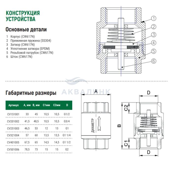 Обратные клапаны ARROWHEAD предназначен для предотвращения обратного движения среды. Обратные клапаны применяются в системах водо- и теплоснабжения. Пружинная конструкция с мягким уплотнением затвора обеспечивает герметичность закрытия клапана, а также возможность монтажа в любом положении по направлению стрелки среды. Корпус и шток обратных клапанов выполнены из латуни CW617N. Рабочая среда: Вода Максимальная рабочая температура среды: 110 °С Максимальное рабочее давление: 20 бар Минимальное рабочее давление: 1 бар Минимальный перепад давления: 0,025 бар