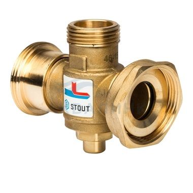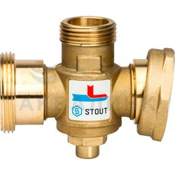 Описание STOUT Термостатический смесительный клапан G 1"1/2M-G 1 1/2F-G 1"M 70°С Cмесительные термостатические клапаны STOUT предназначены для установки на байпасе перед твердотопливными котлами в целях исключения образование конденсата на их греющих поверхностях. Термостатический клапан в зависимости от его модификации поддерживает фиксированную температуру теплоносителя на входе в котел на уровне 55, 60 или 70 градусов цельсия. ОСНОВНЫЕ ХАРАКТЕРИСТИКИ • условная пропускная способность Kvs ‒ 3,2 и 9 м3/ч; • условное давление PN ‒ 10 бар; • рабочая среда ‒ вода, водный раствор гликолей (до 30 %); • макс. температура рабочей среды ‒ 100 оС ; • регулируемая температура Тр: 55, 60 или 70 градусов цельсия. УСТРОЙСТВО Смесительный термостатический клапан имеет два входных штуцера для подвода смешиваемой среды и один выходной. В клапан встроен термостатический элемент, настроенный в заводск