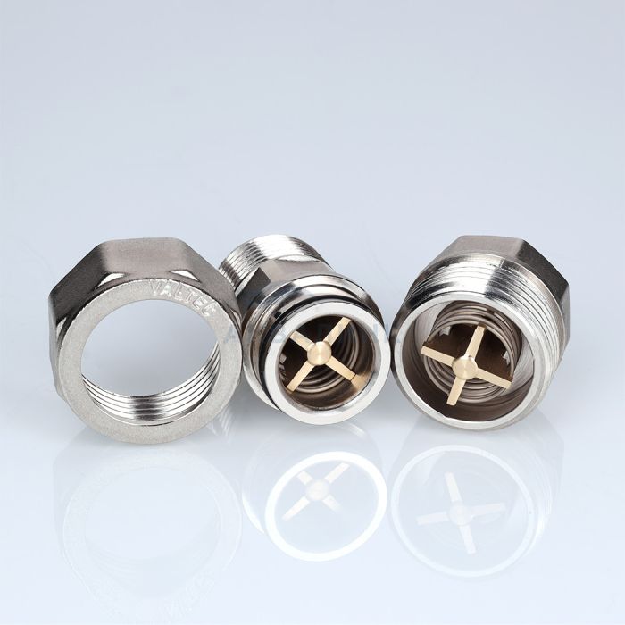 Разъемный сгон-отсекатель VT.538 позволяет разделять внутренние трубопроводы зданий и сооружений на участки, чтобы ремонтировать их без опорожнения всей системы. Основное применение фитинга – присоединение расширительного бака к трубопроводу системы отопления или ГВС. Фитинг состоит из двух полукорпусов, стянутых между собой накидной гайкой. Все три детали изготовлены из сантехнической латуни марки CW617N, никелированы. Между полукорпусами имеется уплотнительное кольцо из EPDM. В состав изделия входят два направленных в противоположные стороны пружинных обратных клапана с латунными (CW614N) золотниками. Когда накидная гайка завинчена до упора, клапаны находятся в открытом положении, не препятствуя протеканию рабочей среды. При раскручивании накидной гайки, подпружиненные золотники перекрывают проходные отверстия полукорпусов. Разъемный сгон-отсекатель VT.538 рассчитан на номинальное давл
