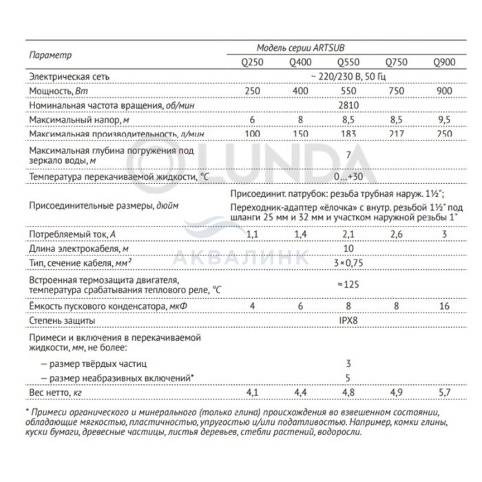 Дренажные насосы ARTSUB — предназначены для отведения воды из затопленных помещений; откачивания дождевой воды, воды из открытых водоемов, колодцев, бочек, резервуаров, цистерн, емкостей, отстойников и приямков с твердым дном и укрепленными стенками; наполнения или осушения бассейнов, ванн и водных аттракционов, обеспечения циркуляции в них воды на непродолжительный период времени; полива в садоводстве. Перекачиваемая жидкость — пресная, чистая или слегка загрязненная вода, а также хлорированная вода из плавательных бассейнов. Насосы подходят как для стационарного, так и для переносного использования. Минимальный остаточный уровень воды - 5 мм.