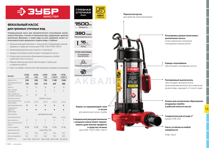 Насос фекальный погружной «ЗУБР» с автоматическим поддержанием давления, термопредохранителем для защиты двигателя, высокими эксплуатационными свойствами и простой конструкцией обеспечивают надёжное и безопасное применение для откачки грязной воды, сточных и бытовых вод на приусадебных и дачных хозяйствах. Благодаря наличию специального режущего механизма с мощным ножом могут перемалывать даже мелкие предметы и средства гигиены, предохраняя канализацию от засорения Корпус из чугуна и нержавеющей стали значительно увеличивает срок службы устройства Поплавковый выключатель обеспечивает автоматическое включения/выключения при изменении уровня воды Регулировка уровней включения/выключения насоса Для исключения образования воздушных пробок в рабочей полости насоса имеется клапан Во время эксплуатации насос не требует никакого обслуживания Термопредохранитель для защиты от перегрева Клапан, за