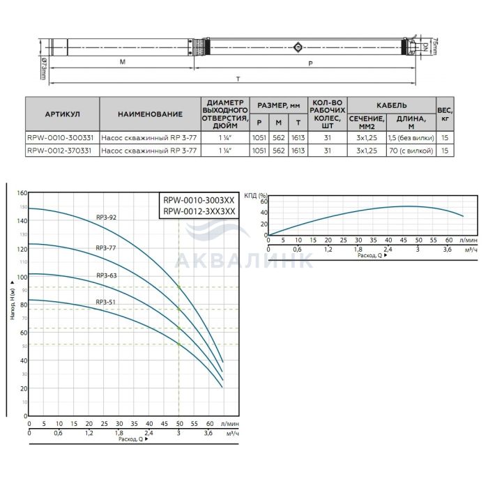Насос ROMMER RP 3-77 скважинный 1-1/4" кабель 70м