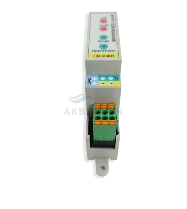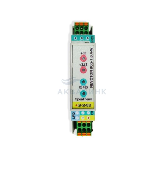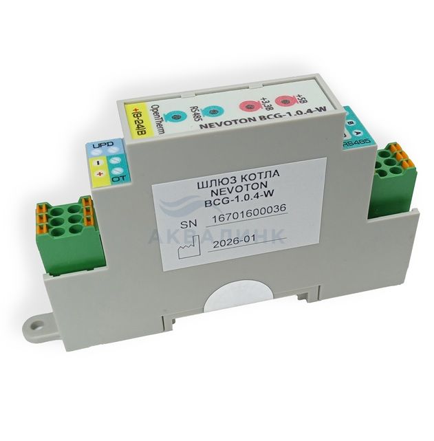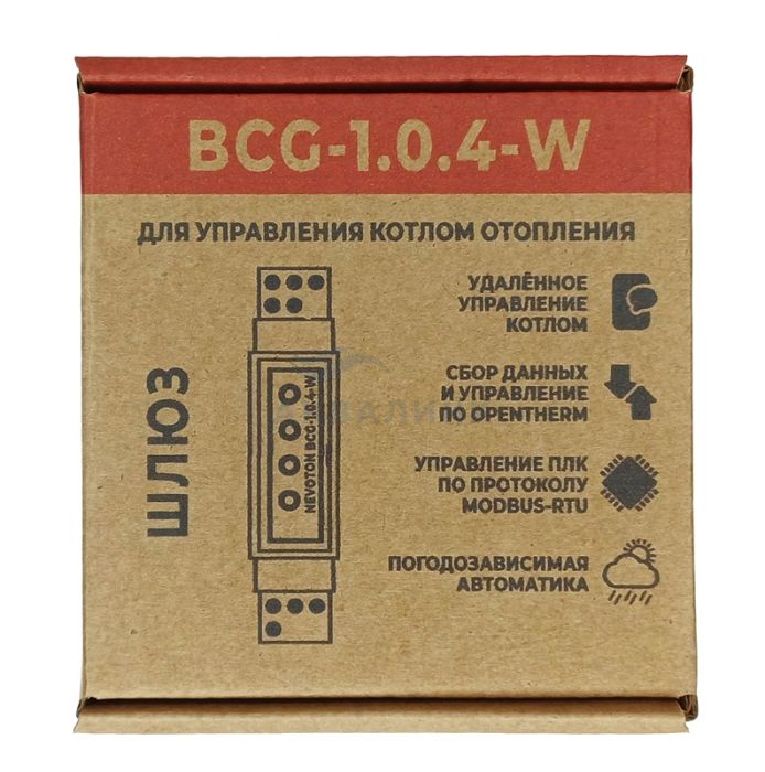 Шлюз OpenTherm – Modbus NEVOTON BCG-1.0.4-W предназначен для работы в качестве подчиненного MODBUS устройства (slave) под управлением ПЛК, и используется для дистанционного управления котлом (газовым или электрическим) системы отопления. Управление устройством (шлюзом) осуществляется посредством чтения и записи регистров Modbus. В процессе работы устройство управляет котлом, выполняя функции внешнего термостата. Это обеспечивает дистанционный контроль параметров котла, получение информации о его состоянии, ошибках, статусе горелки и других показателях. Характеристики питания Устройства: – Номинальное напряжение питания Устройства .............................9 - 24 В; – Род тока ..................................................................................... постоянный; – Максимальный потребляемый ток, не более ..................................... 0,1 А; Настройки интерфейса RS-485: – Скорость передачи данных ................ 19200 бод (задано по умолчанию); – Количество стоп-бит ................................................................. ............. 1; – Контроль четности .......... без контроля четности (задано по умолчанию); – Бит при передачи ....................................................................... ............ 8; Массогабаритные показатели: – Габариты, не более .............................................................. 100х58х18 мм; – Масса, не более ..................................................................... ............. 75 г; Климатические условия при эксплуатации: – Температура воздуха ........................................................ от + 5 до + 40 °C; – Влажность, не более .............................................. ....... 80 % (при + 25 °C).