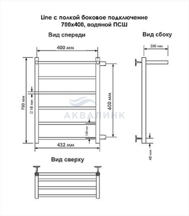 Полотенцесушитель водяной INDIGO лесенка Line с полкой 70/40, боковое подкл. (справа) м/о 60 (н.р.1") (к-2, Черный муар)