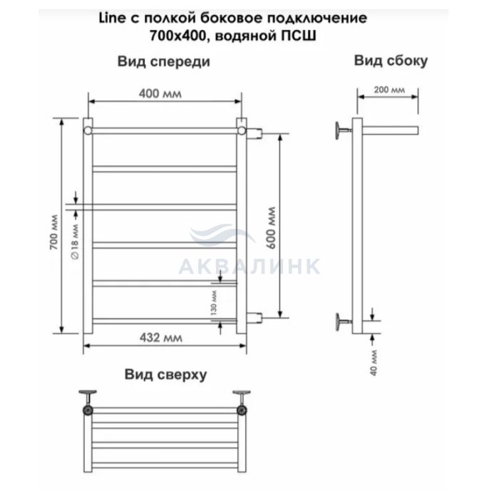 Полотенцесушитель водяной INDIGO лесенка Line с полкой 70/40, боковое подкл. (справа) м/о 60 (н.р.1") (к-2, Черный муар)