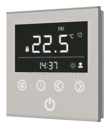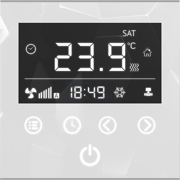 Настенный программируемый регулятор Varmann Vartronic для конвекторов с естественной конвекцией, тип 703101 (черный), 703102 (белый). Визитной карточкой компании Varmann стал новый настенный регулятор собственного производства. Настенный регулятор Vartronic изготавливается в двух цветовых решениях - белого и черного цвета. Регулятор оснащен большим LCD-дисплеем с сенсорным управлением и обеспечивает максимальный комфорт при эксплуатации. Удобный интерфейс позволяет разобраться с возможностями управления даже неопытному пользователю. ОСНОВНЫЕ ХАРАКТЕРИСТИКИ И ВОЗМОЖНОСТИ: Настенный регулятор имеет великолепный дизайн с единой лицевой стороной полностью выполненной из закаленного стекла. Плоский корпус регулятора из ABS-пластика с установкой «в стену» в монтажную коробку. Два цветовых решения - белый и черный. Большой LCD-дисплей с возможностью регулирования яркости свечения и автоматичес