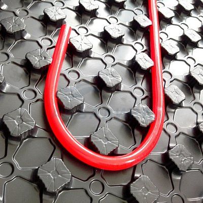 Применение плита предназначена для укладки водяного отопления в полу, крайний ряд бобышек на плите имеет уменьшенный размер и измененную форму, что позволяет фиксировать бобышки одна в другую (внахлёст) для создания единого полотна