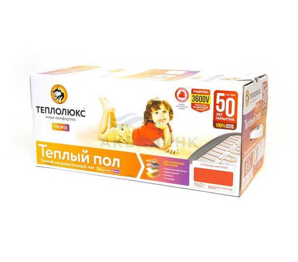 Нагревательный мат «Теплолюкс» Tropix мощностью 160 Вт/кв. м предназначен для обеспечения комфортной температуры поверхности пола. Нагревательный мат устанавливается в плиточный клей или цементно-песчаную смесь. Система обогрева состоит из двухжильного экранированного греющего кабеля и стеклосетки, на которую он закреплен. Маты оптимально подходят для обогрева сухих и влажных помещений, позволяя избежать образования плесени в ванной комнате и грязи в прихожей. Их также можно использовать для обогрева стен и создания системы скрытого полотенцесушителя. Теплый пол Tropix - это гарантией 50 лет от российского производителя. Напряжение питания 220-240 В~ Удельная мощность 160 Вт/м² Ширина мата 0,5 м Длина установочного провода 2 м ± 0,1 м Степень защиты IPX7