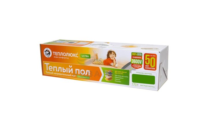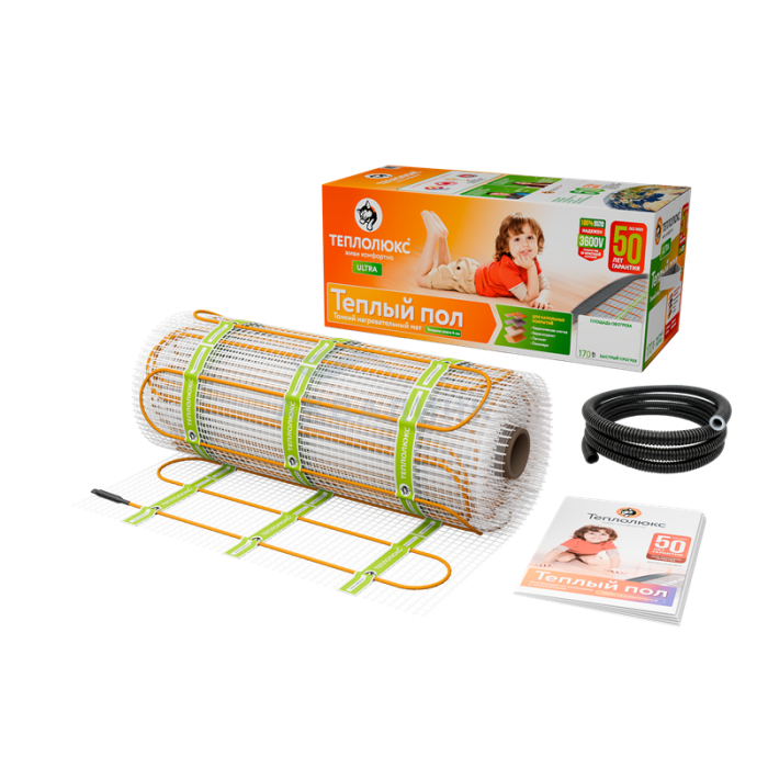 Двухжильные нагревательные маты «Теплолюкс» ULTRA предназначены для комфортного обогрева пола в помещениях любого типа. Монтаж мата возможен как в наливной пол (в стяжку), так и в плиточный клей. Мат легко укладывается в тонкий (5-8 мм) слой плиточного клея и может использоваться под любое напольное покрытие: плитку, керамогранит, ламинат, линолеум. Напряжение питания 220-240 В~ Удельная мощность 170 Вт/м² Ширина мата 0,5 м Длина установочного провода 2 м ± 0,1 м Степень защиты IPX7