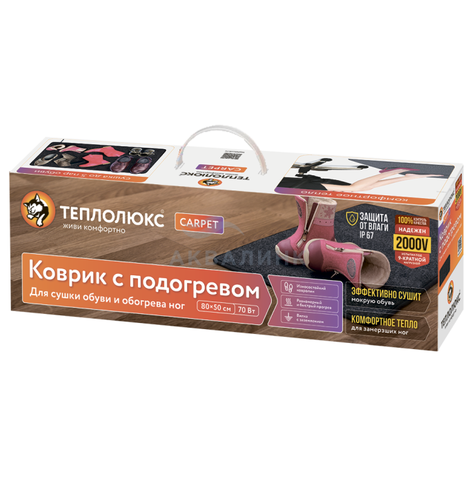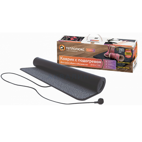 Дождь, слякоть, мокрый снег портят нашу обувь и создают дискомфорт. Неправильный уход может привести к быстрой потере формы обуви, неприятному запаху или даже полной непригодности. Теплолюкс Carpet бережно высушит обувь и продлит срок ее службы. Преимущества 1. Температура на поверхности коврика не превышает 40 °С, что обеспечивает комфортный обогрев ног и деликатную сушку обуви 2. Полностью готов к использованию — просто включается в розетку 3. Компактный и экономичный — электропотребление всего 50 Вт/час 4. Безопасен при эксплуатации: высокая защита даже от струй воды — степень защиты IP67 5. Легко очищается от пыли и грязи Способ подключения К сети 220В Питание 220–230 В~ / 50 Гц Длина соединительного провода, м 1,8 Площадь обогрева 0.4 кв.м. Цвет Серый Размеры: 50x80 см
