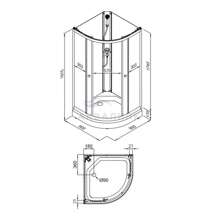 Душевая кабина, душевой набор (смеситель с переключателем, верхний душ, душевая лейка), сифон