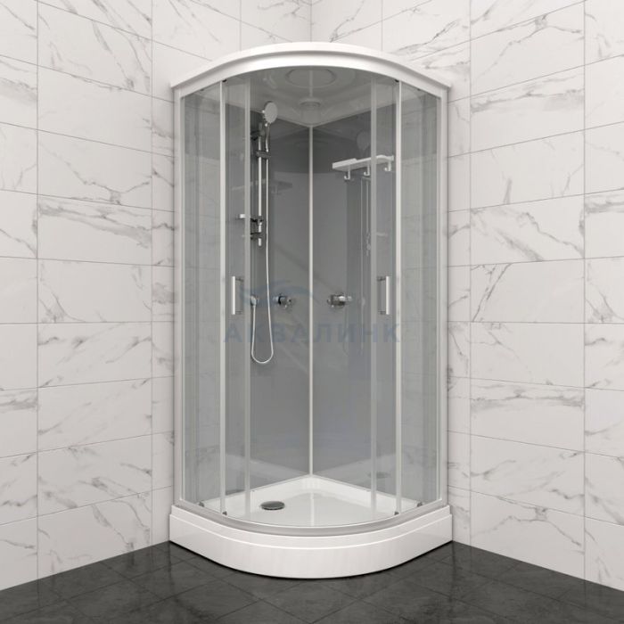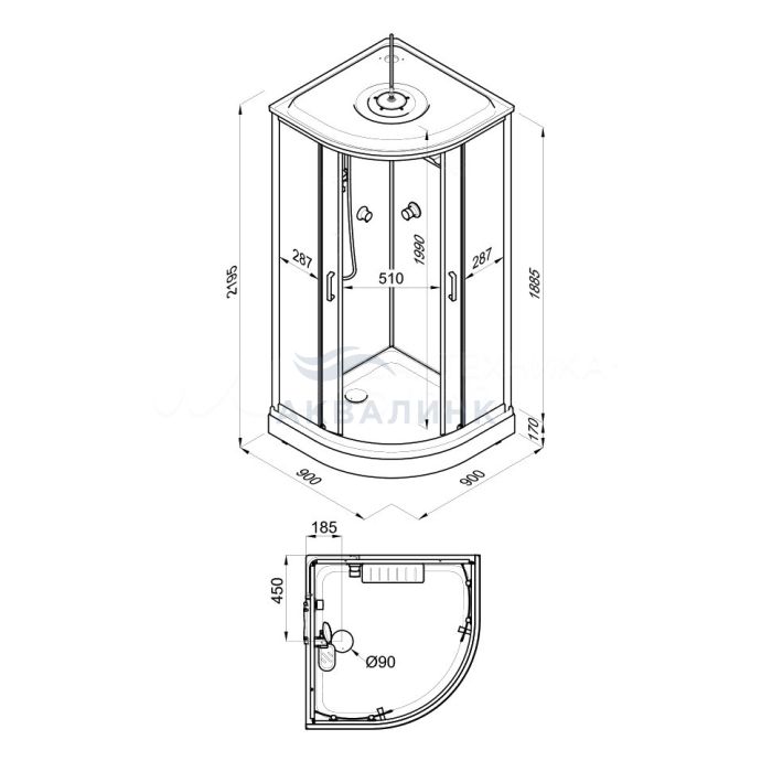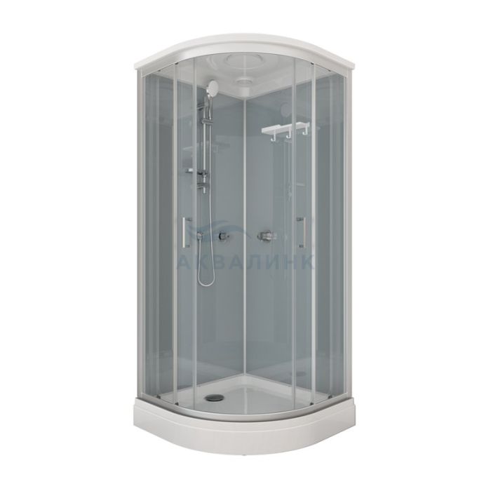 Раздвижная система дверей Двери с прозрачным полотном Поддон из акрила: высокопрочный, легкий, гигиеничный и долговечный. Гладкая поверхность не впитывает загрязнения Поддон кабины оснащен антискользящим покрытием Верхний душ расположен в крыше кабины С полкой Оснащение: крючки