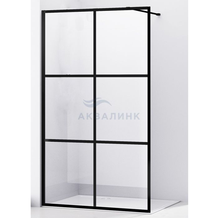 "Душевая перегородка Стекло: закаленое прозрачное 6 мм Профиль: черный Особенности: • латунный кронштейн • универсальный монтаж • поддон приобретается отдельно"