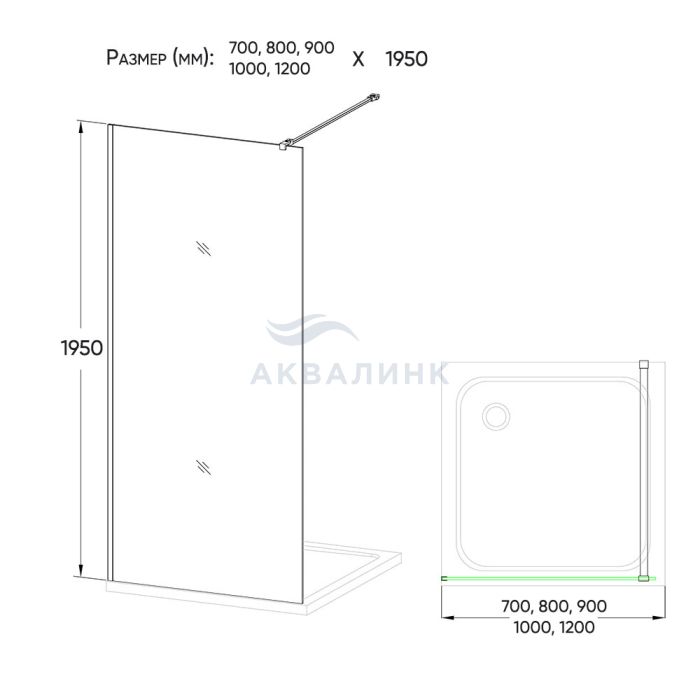 "Душевая перегородка Стекло закалённое безопасное 8 мм Профиль анодированный алюминий Усиливающая пристенная штанга из нержавеющей стали - 900 мм Поддон приобретается отдельно"