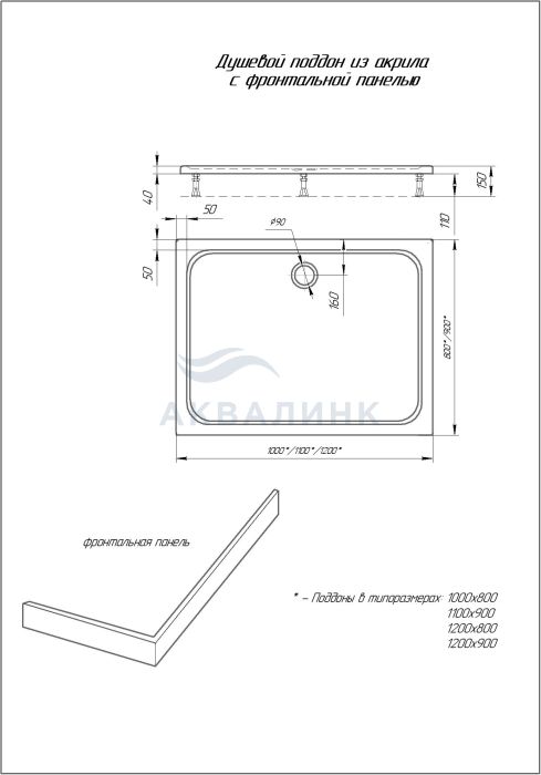 Поддон Фронтальный экран Цельносварной алюминиевый каркас с регулируемыми ножками - Сифон для поддона приобретается отдельно