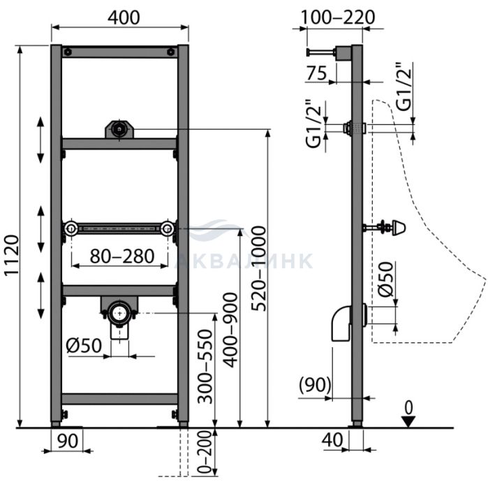 Инсталляция для писсуара А107\1120 A107/1120 Материал: металл обработанный порошковой краской Выдвижные ноги, регулируемые в диапазоне 0-200 мм Для подключения устройства смыва для писсуара ATS001 Интервал крепления писсуара 80-280 мм Регулируемые по высоте монтажные перекладины