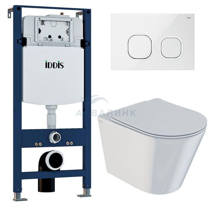 Инсталляция IDDIS Profix BASCALUi73 с безободковым унитазом Calipso с микролифтом кнопка Uniglass 001 белое стекло