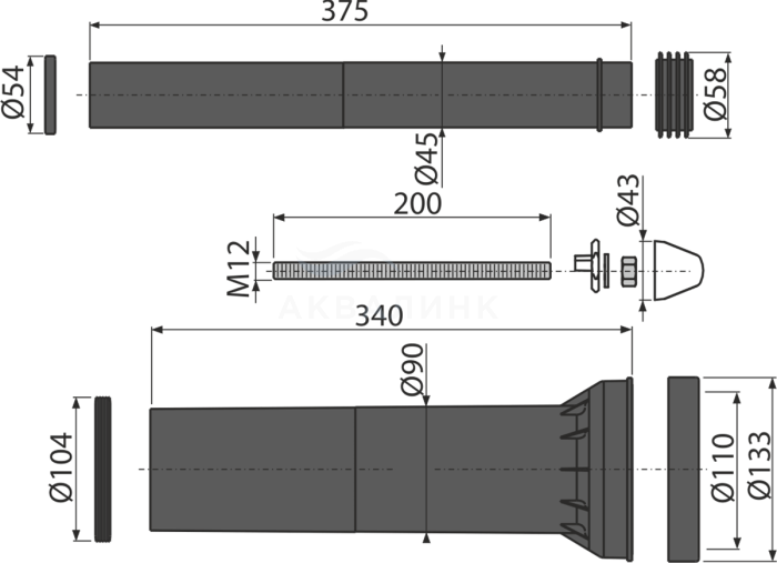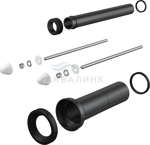 M9000 Комплект принадлежностей к унитазу с удлиненными деталями для людей с ограниченными физическими возможностями одержание комплекта Патрубок сливной для подключения подвесного унитаза к стокам, полипропилен, Ø90 мм, с прокладками Соединительный патрубок для подключения подвесного унитаза к бачку, полипропилен, Ø45 мм, с прокладками и манжетой Монтажный комплект для крепления унитаза: шпилька М12 – 2 шт., шайба – 4 шт., колпачок – 2 шт., гайка – 2 шт., гофрированный рукав – 2 шт.