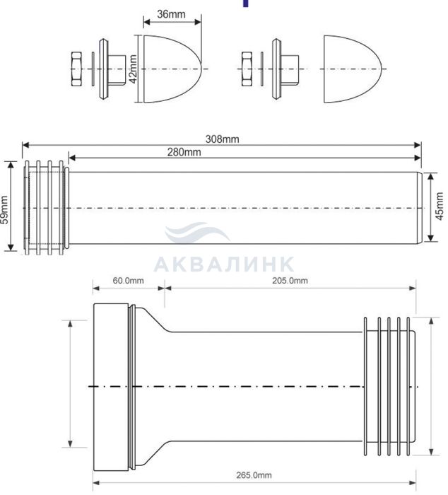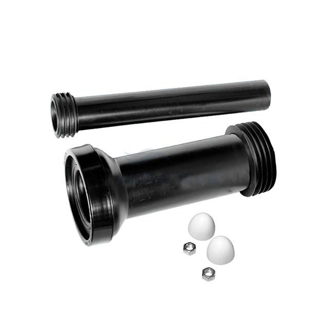 Переходный соединительный элемент с прокладкой (L304мм; вход/выход=45/59мм) для инсталяций с крепежными гайками, белыми декоративными заглушками и фановой трубой (L265мм; выход Дн=90-110мм); цвет-черный