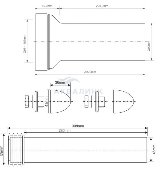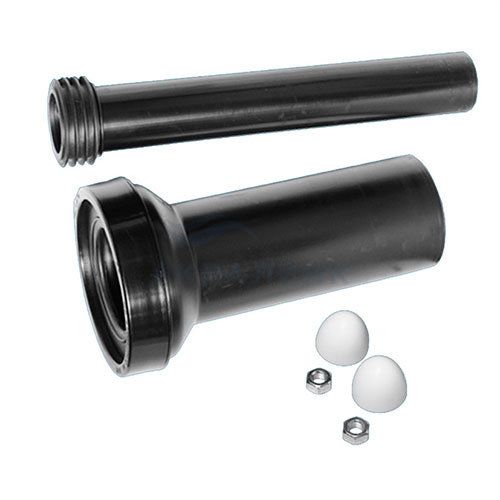 Комплект соединительный L=304 мм, вх/вых=45/59 мм с манж., бел. заглушки, труба L=265 мм, 90 мм Переходный соединительный элемент с прокладкой (L304мм; вход/выход=45/59мм) для инсталяций с крепежными гайками, белыми декоративными заглушками и фановой трубой (L265мм; выход Дн=90мм); цвет-черный